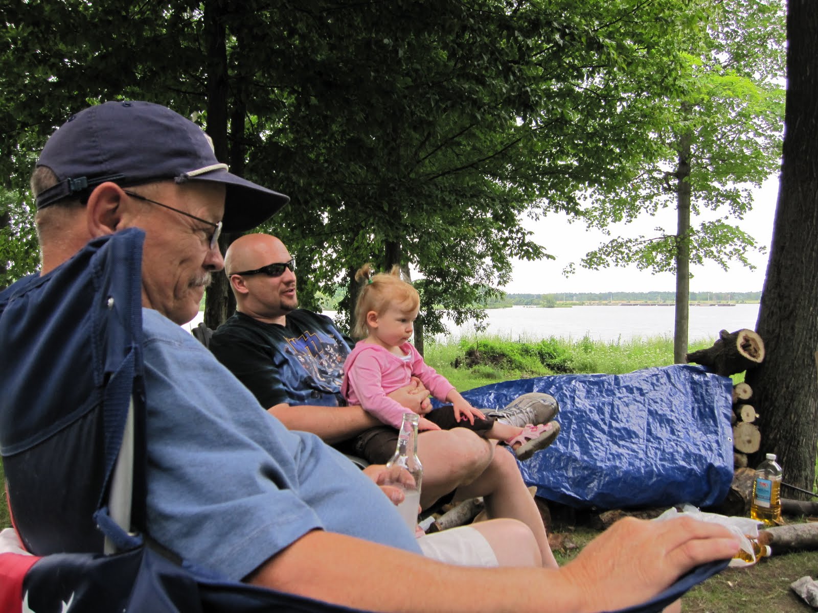 Lynn advised the Park Staff, since this next was in a tree between two busy campsites and a path to the water. We thought they wouldn't do anything, but they eventually sent to teenagers (okay, maybe they were 20) in a pick up truck to get it down. They hadn't the first clue what to do and couldn't reach it anyway. We sat around an early fire and watched them try to figure it out, wondering if we'd all end up being stung. There were no stings following this incident, However, Ray did manage to get stung on his pinkie earlier in the day when sitting in the grass. Fortunately, his bee sting allergy seems to have drastically decreased in adulthood. Yay.